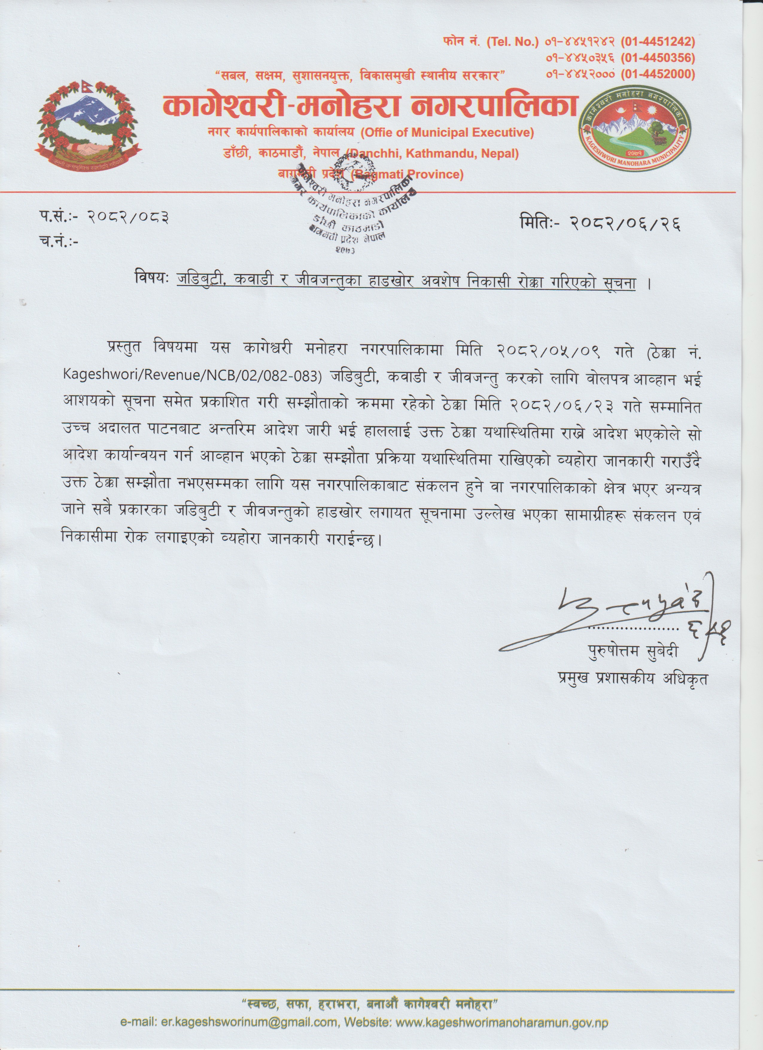 जडिबुटी, कवाडी र जीवजन्तुका हाडखोर अवशेष निकासी रोक्का गरिएको सूचना