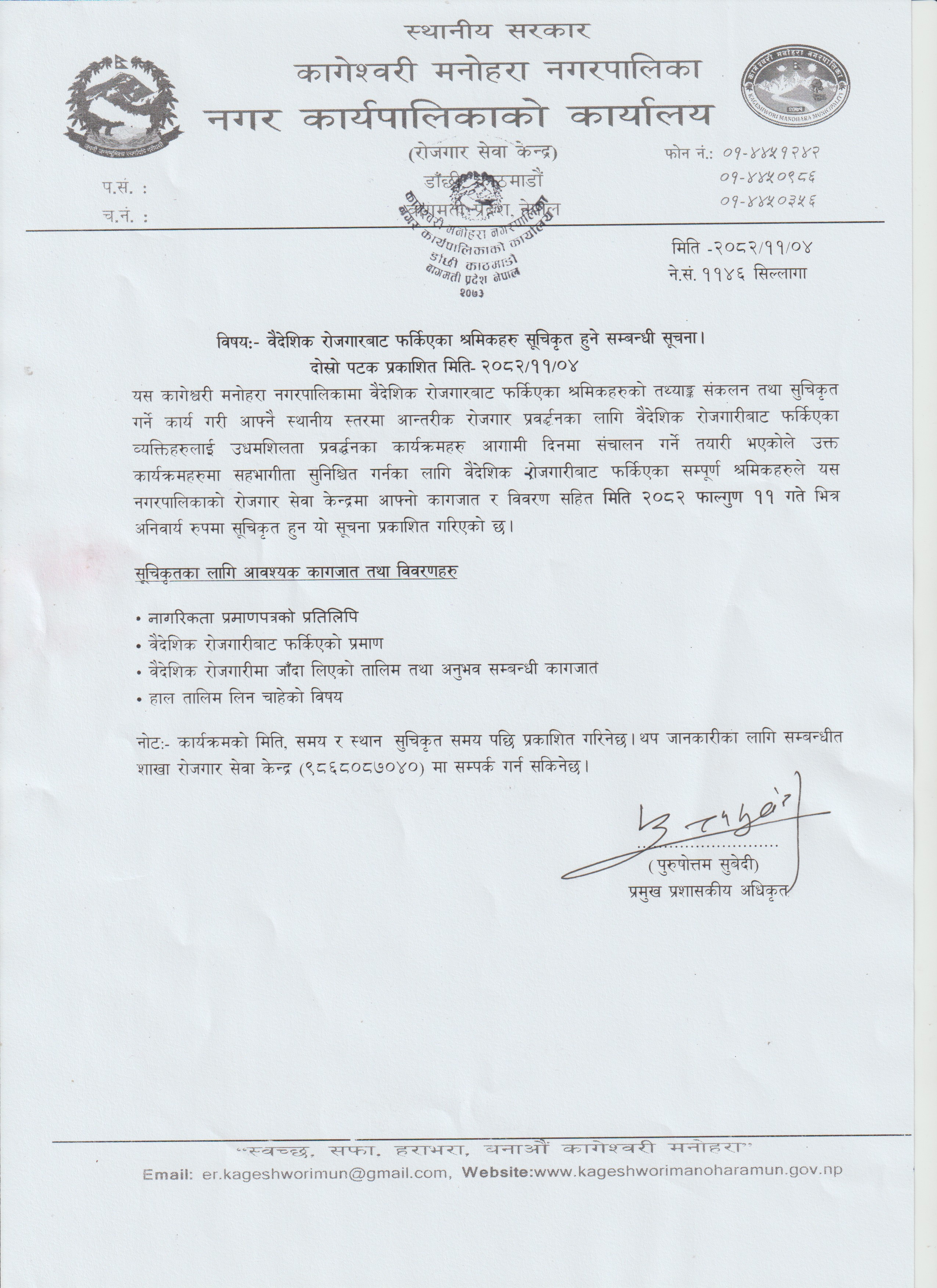 बैदेशिक रोजगारबाट फर्केका श्रमिकहरु सूचिकृत हुने सम्बन्धी सूचना। (दोस्रो पटक प्रकाशित)