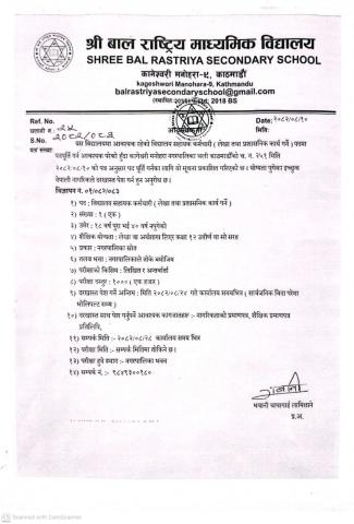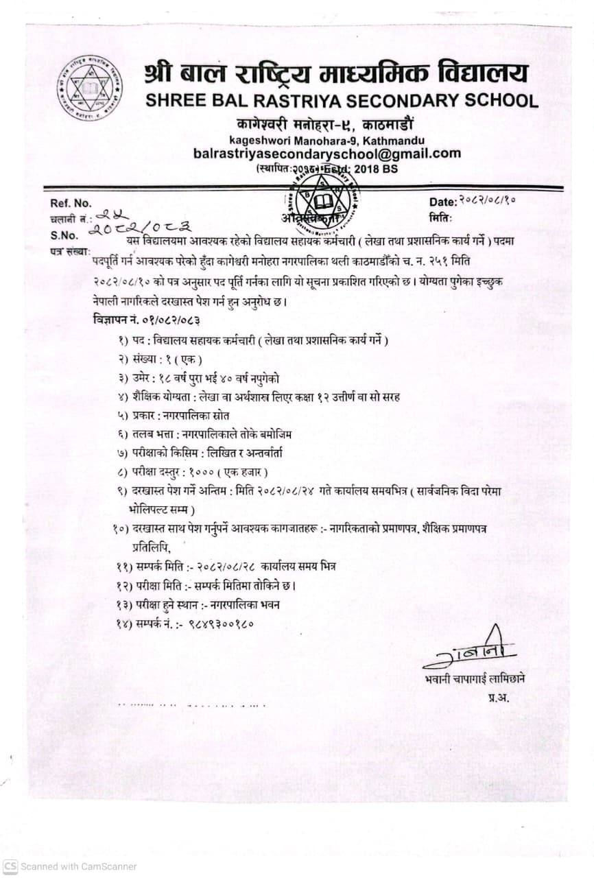 श्री बाल राष्ट्रिय माध्यामिक विद्यालयमा विद्यालय सहायक कर्मचारी आवश्यकता सम्बन्धी सूचना ।