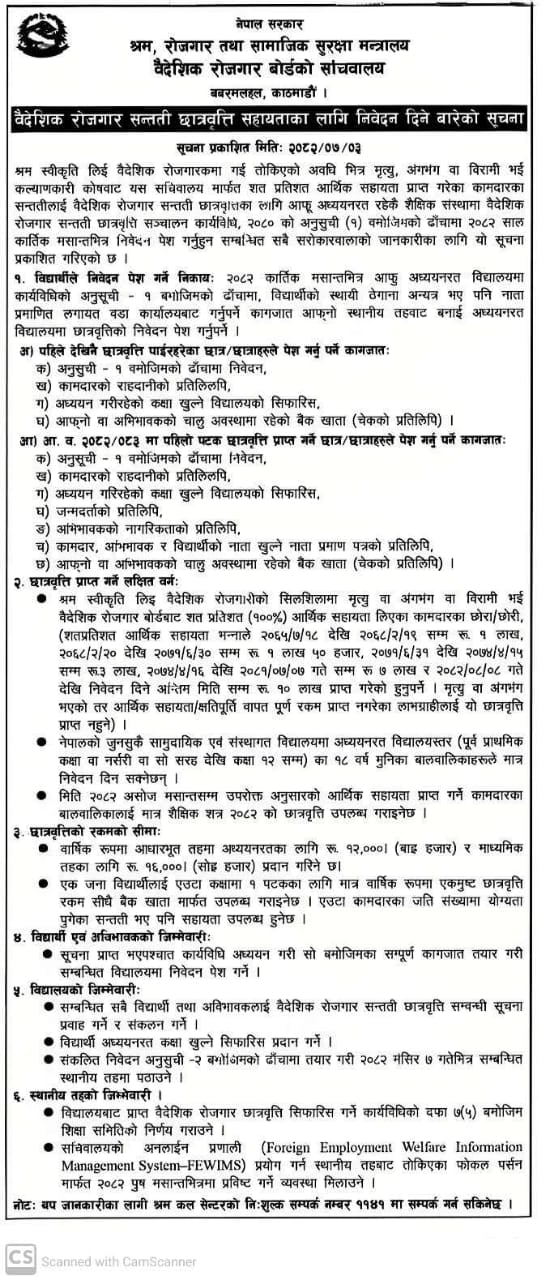 श्रम,रोजगार तथा सामाजिक सुरक्षा मन्त्रालयको बैदेशिक रोजगार सन्तती छात्रवृत्ती सहायताका लागि निवेदन दिने बारेको सूचना ।।