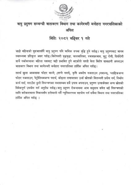 वायु प्रदुषण सम्बन्धी वातावरण विभाग तथा कागेश्वरी मनोहरा नगरपालिकाको अपिल